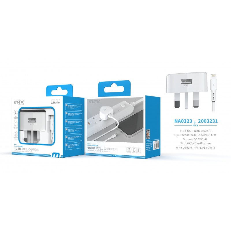 NA0323 2.4A Single USB Wall Charger, with Lightening Cable, White