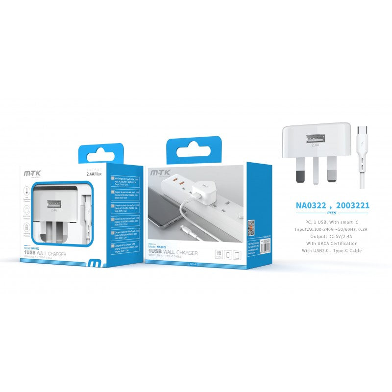 NA0322 2.4A Single USB Wall Charger, with Type-C Cable, White