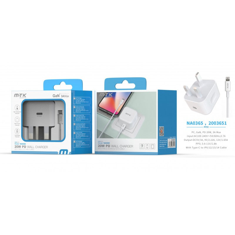 NA0365 Type-C 20W PD Wall Charger with Type-C to Lightning Cable, 5V 3A, White